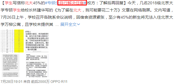 据公开报道,2018年一篇《为了留在北大,我可能要花二十万》的文章引发热议,该文称北京大学因宿舍资源紧张,至少有45%的专硕新生无法入住万柳公寓,将自行解决住宿问题,可以拥有宿舍的55%的“幸运儿”将由抽签决定。
