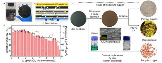 在这里,作者报道了化学还原氧化石墨烯(rGO)的超强提金能力,在25°C和60°C下分别从10 ppm的溶液中提取黄金时,其提金容量分别达到1850 mg/g和9059 mg/g,同时对于低至ppt浓度的金离子同样具有有效的吸附。在萃取过程中,还原氧化石墨烯将>95%的金离子还原为金属金,避免了吸附后处理所需的洗脱和沉淀。此外,可以选择性地提取黄金,而不会吸附电子垃圾中通常存在的其他14种元素。该工作同时使铜的回收成为可能,铜是电子垃圾中第二有价值的金属。作者业展示了一种使用还原氧化石墨烯膜的高效连续提金工艺。这项发现为解决全球电子垃圾挑战和黄金稀缺问题提供了一个有前景的解决方案。