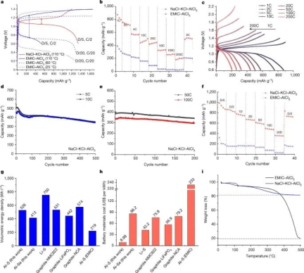 锂离子电池(简称LIB)是一种可充电电池,最早由埃克森美孚(Exxon)的化学家斯坦利•惠廷汉姆(M Stanley Whittingham)于20世纪70年代提出。锂离子电池通常用于便携式电子设备和电动汽车,并且在军事和航空航天应用中日益流行,目前我们生活中使用最多的就是这种锂离子电池,锂离子电池的三个主要功能部件是正极和负极以及电解质。通常,传统锂离子电池的负极由碳制成。正极是金属氧化物,电解质是有机溶剂中的锂盐。电极的电化学作用在阳极和阴极之间发生逆转,这取决于流过电池的电流方向。但我们知道,锂离子电池存在很多问题,例如,锂离子电池中锂、镍、钴等资源短缺,同时,可能产生安全隐患,电池充电过快可能导致短路,导致爆炸和火灾,这些都严重限制了后续发展。尽管装有金属负极的电池因其较高的能量密度和较低的复杂性而具有吸引力,后者使其更易于回收,但枝晶问题造成的电池短路威胁已阻碍了该技术的实施。北京大学庞全全研究员和美国麻省理工学院Donald R. Sadoway教授等人报道一种双向的、低成本的电池,使用由NaCl–KCl–AlCl3组成的熔盐电解液操作的快速充电铝-硫族电池。这些氯铝酸盐熔体含有高浓度的AlCl3,含有链状AlnCl3n+1-物种,例如Al2Cl7-、Al3Cl10-和Al4Cl13-,其与Al–Cl–Al键合赋予容易的Al3+去溶剂化动力学,导致高法拉第交换电流,从而形成电池高速充电的基础。这种化学与其他铝电池的区别在于,与各种低容量化合物配方相反,选择了硫族元素正极,与引发高极化的室温离子液体相反,选择熔融盐电解质。研究表明,铝和硫族元素之间的多步转化途径允许在高达200 ℃的温度下快速充电,电池在非常高的充电速率下经受数百次循环,而不会形成铝枝晶。对于可扩展性而言,重要的是,预计铝硫电池的电池级成本将低于当前锂离子技术的六分之一。这种化学物质由地球上储量丰富的元素组成,这些元素可以合乎要求地获得,并在略高于水沸点的温度下运行,具有低成本、可充电、耐火、可回收电池的所有必要条件。相关研究工作以“Fast-charging aluminium–chalcogen batteries resistant to dendritic shorting”为题发表在国际顶级期刊《Nature》上。祝贺北京大学!