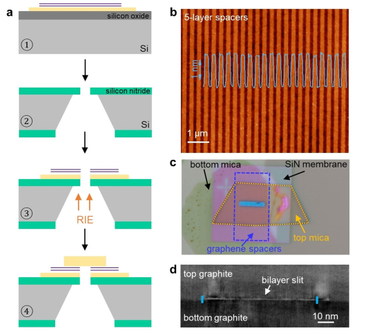 通过范德华力组装制造的2D通道。简而言之,从块状白云母或石墨中剥落两个原子平面晶体,成为毛细管的顶壁和底壁。制造多层石墨烯以充当两个云母或石墨晶体之间的间隔物。