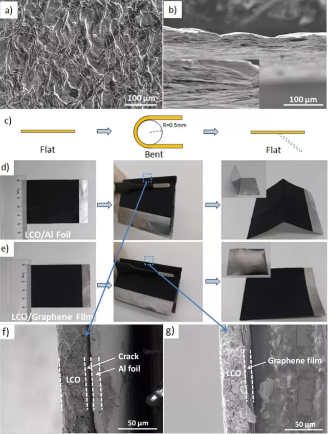 图1. 石墨烯薄膜a)表面SEM图像和b)断面SEM图像。c)柔性电极弯曲的示意图。d)LCO/铝箔和e)LCO/石墨烯膜的电极弯曲图片。f)LCO/铝箔和g)LCO/石墨烯薄膜电极折痕的断面SEM图像
