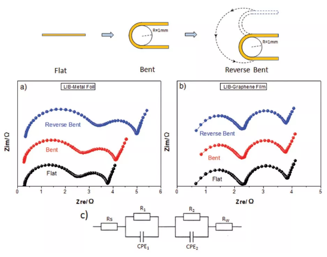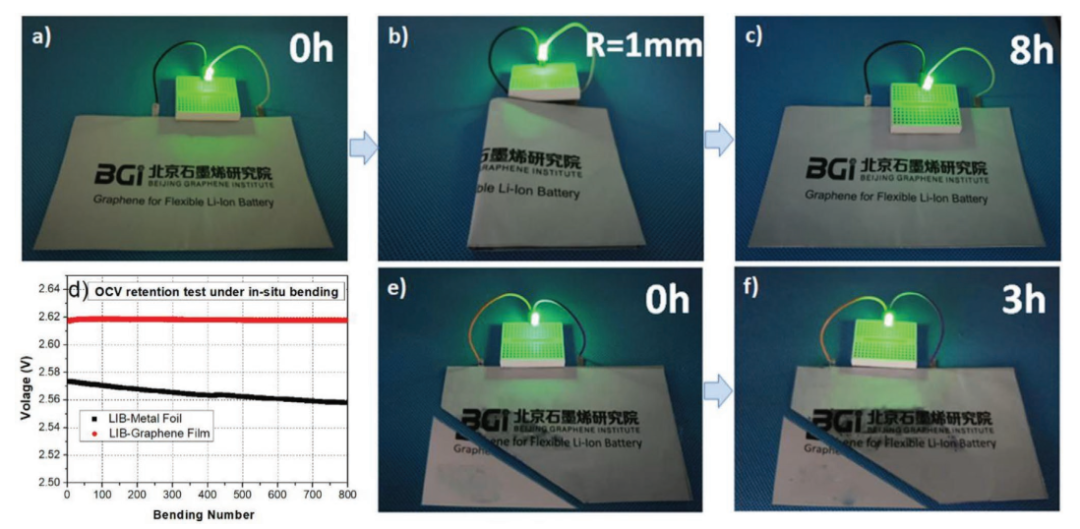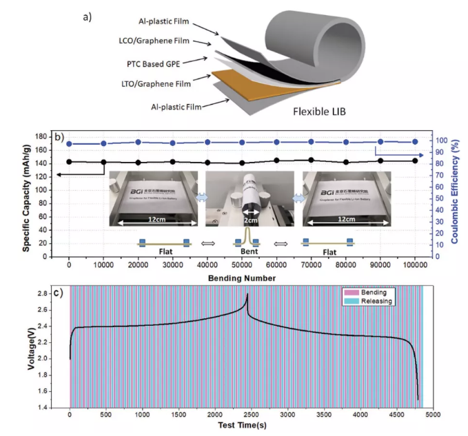 GO-GPE在提高LIB的安全性和循环稳定性方面起着重要作用,这归因于高热稳定性、增强的电解质吸收、优异的离子电导率和锂离子转移数。这种柔性锂离子电池具有出色的电化学稳定性和机械强度。电池即使弯曲10万次后,容量也几乎没有损失,为了进一步研究LIB-石墨烯薄膜的柔韧性,在5 mm s-1的低速下进行了原位弯曲测试。在一个电化学循环中进行约90次弯曲,充放电曲线几乎没有变化,这进一步表明了LIB-石墨烯薄膜的出色柔韧性。