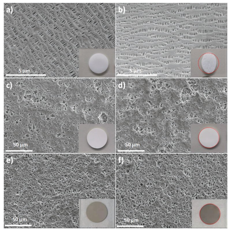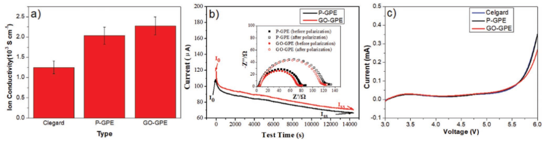 图2. 商用Celgard隔膜(a,b),P-GPE(c,d)和GO-GPE(e,f),热处理前(a,c,e)和后(b,d,f)的SEM图像,在140°C下放置1小时