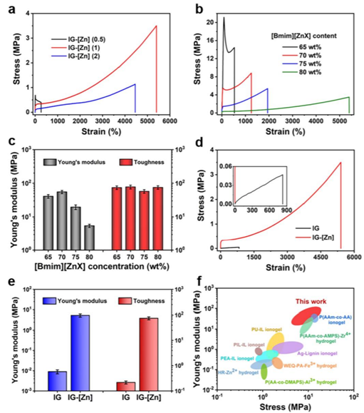 在本研究中,通过添加卤代金属盐离子液体,调整聚合物网络结构,制备多功能强韧的离子凝胶,结合离子液体和金属离子的独特性能。在提出的方法中,卤代金属盐离子液体被用作超分子溶剂;它们提供了大量的金属配位点,与线性聚合物链形成稳定的动态交联网络,提高了整个网络的机械稳定性,缓解了疲劳损伤,防止了裂纹的扩展。由于溶剂分子和聚合物链之间存在丰富的可逆键,疲劳的或废弃的离子凝胶也被反复拆分和重组。所制备的含有大量溶剂的离子凝胶具有高强度、高韧性、抗疲劳、对裂纹扩展不敏感、良好的自我修复和可回收性。该增韧策略被推广到制备含有不同金属离子的卤代金属离子,通过形成动态可逆的物理交联来设计具有特定功能和多种用途的材料。