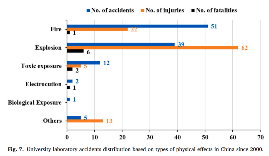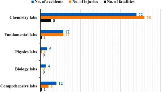 可以明显看到,化学实验室中发生的安全事故数量遥遥领先。如果要深究造成事故的原因,违反操作流程可以排到第一位,而事故造成的后果通常就是起火和爆炸。