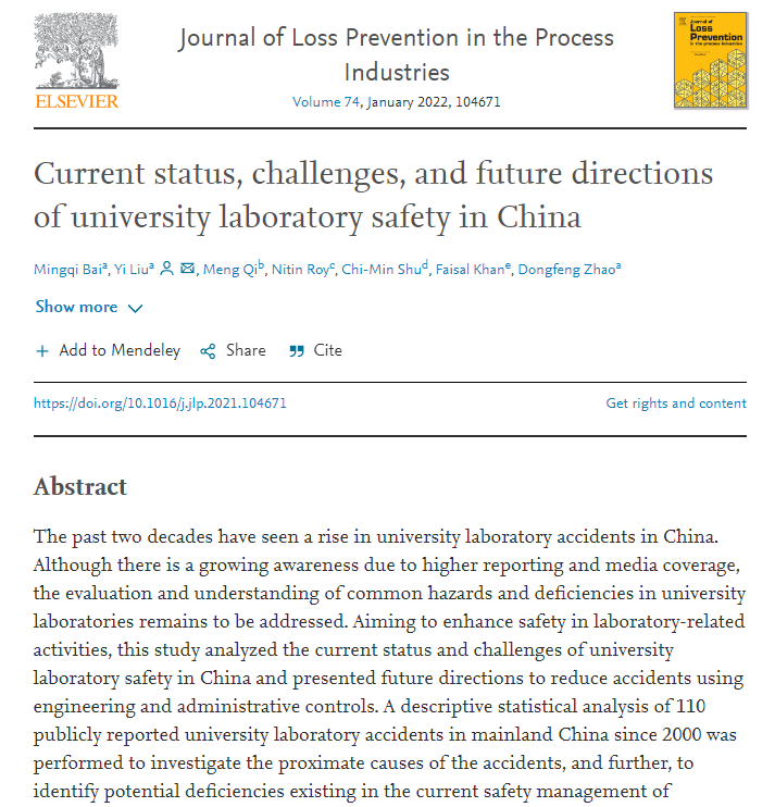 论文显示短短十几年,中国高校发生了110起实验室事故,导致102人受伤,10人死亡,其中化学实验室发生事故最为频繁。而这110起事故中超过80%导致了火灾和爆炸两种直接后果,根据欧洲化学工程联合会 1971 年提出的工艺安全管理体系中的14个要素,研究者们发现,这110起事故中主要存在实验人员培训、过程危害分析、过程安全信息和机械完整性4项PSM要素的欠缺。