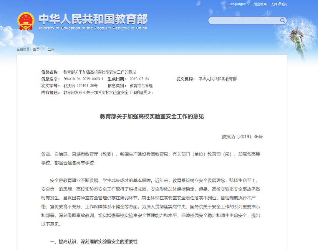 早在2019年6月,教育部就发布了《关于加强高校实验室安全工作的意见》,其中特别提到:要强化安全红线意识,深刻理解实验室安全的重要性,坚决克服麻痹思想和侥幸心理,切实解决实验室安全薄弱环节和突出矛盾。