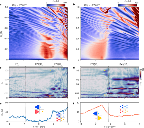 在D/ε0=1 V nm−1(图3c,e)时,波函数向WSe2强烈极化,可看到一些显著的差异。首先,在低密度下,一个傅里叶频率峰值明显出现在fν=1/12以下,表明存在费米表面,其占有率相对于Sym(12)−较小。将这个相位表示为FP(6,6)+,具有六个较大和六个较小的费米口袋。这里明显的极化可能源于自旋轨道诱导的带分裂。其次,FP(6,6)+相和相邻FP(2,2)+相(有两个大的和两个小的费米口袋)之间的转变发生在较低的空穴密度(∣n∣=5×1011 cm−2)处。最后,观察到在整个FP(2,2)+相(除了它与电阻相竞争的小区域)中建立了超导性,在高掺杂侧结束,开始了另一个复杂的极化相,其特征额外频率峰值的出现(图3c,e)。重要的是,在FP(2,2)+中,对于FP(2,2)−,发现fν(1)+ fν(2)=1/2。
