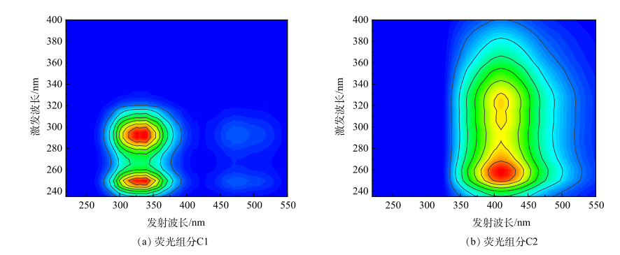 平行因子法能够对 DOM 的三维荧光谱图进行解谱,充分利用荧光数据,鉴别单一荧光组分,故采用三维荧光光谱进行平行因子分析 (PARAFAC),污水厂水样的荧光光谱特征进行解析,通过分析,得到 1 种类蛋白荧光组分和 1 种类腐殖酸荧光组分:C1(Ex/Em=245 nm/340 nm) 为色氨酸荧光峰,C2(Ex/Em=260 nm/410 nm) 为富里酸荧光峰,整明此污水厂含有类蛋白质组分和类腐殖质组分。