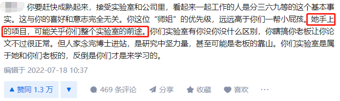 作为研究生,你只是看到并质疑博士后师姐私用移液枪这件事,但她手上的项目,可能关乎你们整个实验室的前途。人家念完博士进站,是研究中坚力量,甚至可能是老板的靠山。你们实验室是属于她和你们老板的,反倒是你们才是来学习的。