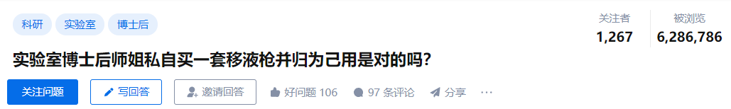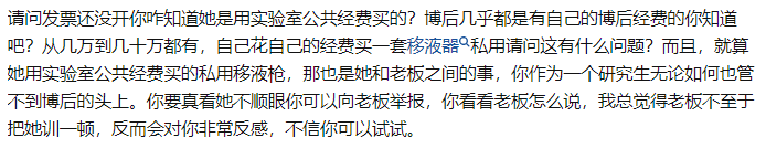 知乎就有这样一则话题,研究生提问,“实验室博士后师姐私自买一套移液枪并归为己用是对的吗?” 引发热议: