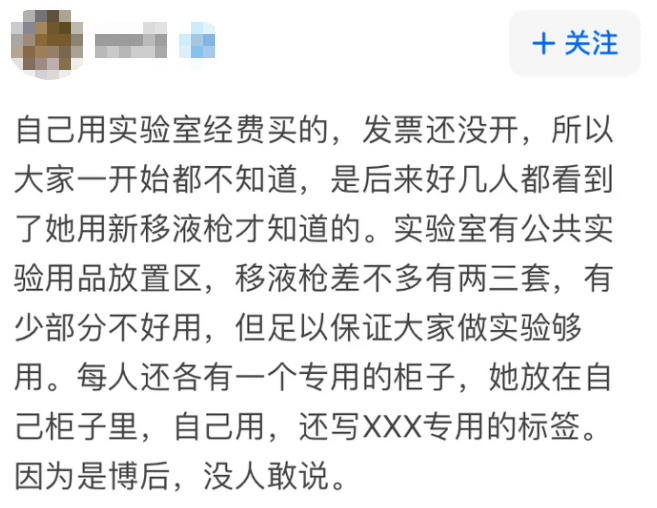 她自己用实验室经费买的,发票还没开,所以大家一开始都不知道,是后来好几人都看到了她用新移液枪才知道的。实验室有公共实验用品放置区,移液枪差不多有两三套,有少部分不好用,但足以保证大家做实验够用。每人还各有一个专用的柜子,她放在自己柜子里,自己用,还写XXX专用的标签。因为是博后,没人敢说。