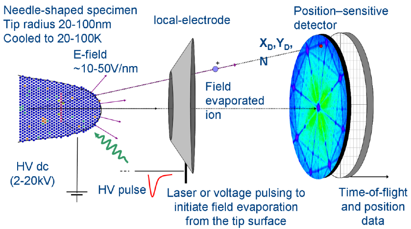 原子探针是基于场发射原理制成的。在超高真空及液氮冷却试样条件下,在针尖试样上施加足够的正高压,试样表面原子开始形成离子并离开针尖表面。这称为场发射。通过在样品与近局域电极之间施加电场,在电压脉冲或激光脉冲作用下使材料表面的原子逐层剥离出来,剥离出的离子经过直流电场后飞向探测器。根据离子的飞行时间,可以推算出每个离子的质合比;根据离子到达探测器的位置和次序,推算其原始位置,通过软件对数据进行重构,从而还原各个原子在材料的三维空间分布。