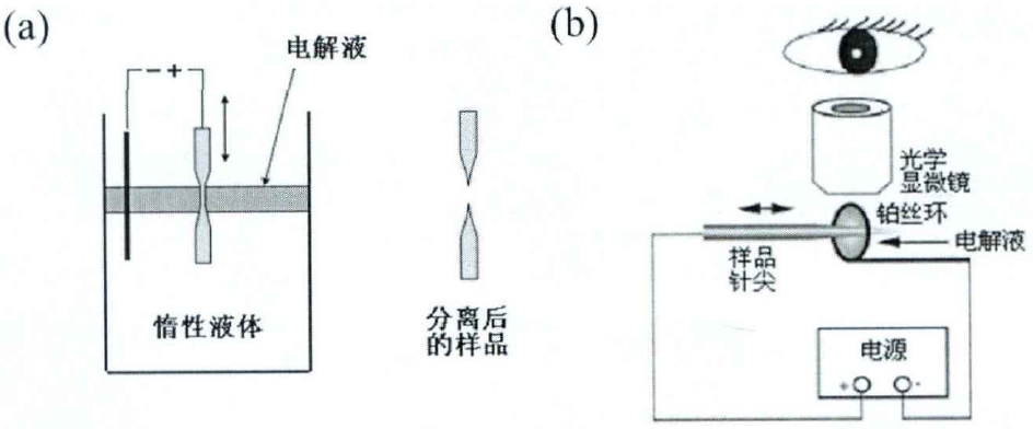 普通金属样品通常采用电解抛光制样。电解抛光可以分为粗抛光和显微抛光两个阶段,示意图如图2所示。第一个阶段,用到的电解液是30%的高氯酸冰醋酸。首先利用精密切割机将样品切割成0.5×0.5×20 mm3的长条状,然后将样品夹持稳定使其处于竖直方向,最后通过偏心轮机械装置实现试样上下进出电解液从而完成抛光,直流电压为15-20 V,电流控制在0.01-0.02 mA。第二阶段是在光镜下完成的,用到的电解液是5%的高氯酸乙二醇醚,阴极为一直径5 mm左右的铂金环。通过手动控制样品进出电解液的频率和深度,来控制样品针尖的粗细和形状,直至样品尖端半径<100 nm。