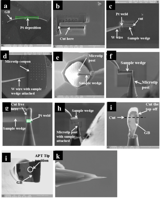 对于不导电样品以及特殊样品的定位制样(定位制取晶界及析出相等样品),通常使用FIB技术进行加工,通过纳米手及Ga离子切割从样品表面提取出一个条状(侧面楔形状)样品,并用Pt,W或C等采用气体沉积将样品焊在基座上。然后使用离子束进行环状切割,最终加工成100 nm以下尺寸的针尖样品。FIB制样过程如图3所示,(a)确定取样位置,(b)在取样位置周围挖出沟槽,(c)在样品上方镀铂保护,(d)准备好放置针尖样品的样品台,(e)在挖出的样品柱放置在样品台中任意尖柱中心,(f)侧面观察图,(g)用铂将样品柱和尖柱焊在一起并切掉多余部分,(h)完成后形貌,(i)侧面形貌,(j)样品俯视图,开始减薄,(k)制备完成的最终针尖样品。