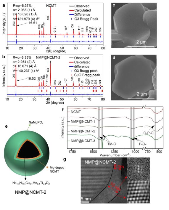 施加不同的涂层量(1-3 mol%),将涂层材料标记为NaMgPO4@NaNi0.4Cu0.1Mn0.4Ti0.1O2-X(NMP@NCMT-X,其中X表示Mg2+和PO43-的不同量)。通过X射线衍射(XRD)精修确定NCMT和NMP@NCMT-2的结构(图1a,b),扫描电子显微镜(SEM)图像显示,NCMT和NMP@NCMT-2具有块状形态,正面标高为4-7μm宽,侧面标高为0.5-1.5 μm厚。将表面残留的碱转化为固体电解质,NMP@NCMT-2更光滑。图1e显示了NMP@NCMT-2结构。