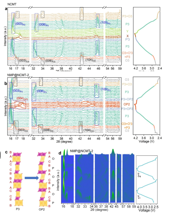 图4:(a)NCMT和(b)NMP-NCMT-2的原位XRD,(c) 观察到P3相从(001)方向到OP2相的转变图。(d) NMP@NCMT-2在最初的两个循环中的现场XRD数据的全范围等高线图