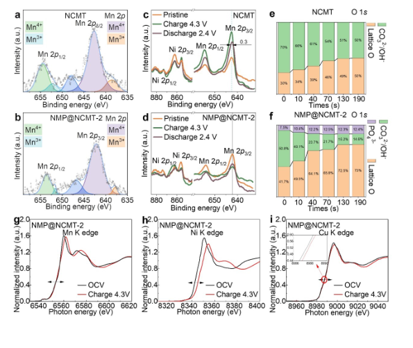 图3:(a) NCMT在Mn2p处的X射线光电子能谱(XPS)图谱(b)NMP@NCMT-2在Mn2p处的XPS图谱(c) NCMT电极的Ni2p和Mn2p处的XPS图谱(d)NMP@NCMT-2在Ni2p和Mn2p的XPS谱(e)NCMT的表面残余碱和晶格O变化作为蚀刻时间的函数(f)NMP@NCMT-2的表面残碱率及晶格O作为蚀刻时间的函数(g)Mn K边缘,(h)Ni K边缘,(i)NMP@NCMT-2 Cu K边缘的X射线光谱。