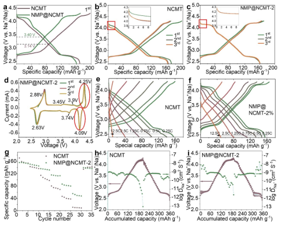 循环伏安法(CV)测定CMT和NMP@NCMT-2的电化学性能,测试显示了多个相变,TM离子的价态在充放电过程中发生了变化。对比表明NaMgPO4涂层可以显著提高结构稳定性。固体电解质NaMgPO4是一种优良的离子导体提高了阴极的倍率性能(图2e–g)。