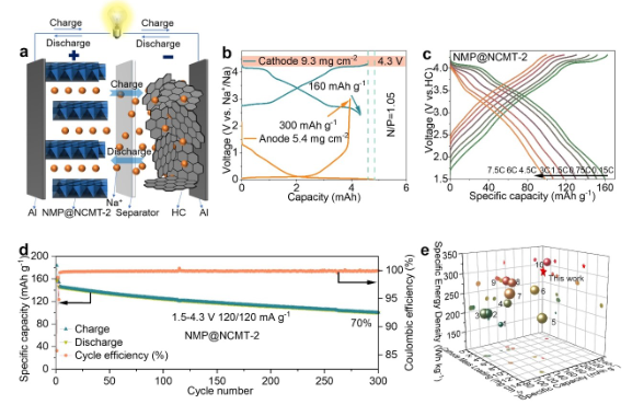 图5:(a)NMP@NCMT-2//HC全电池示意图(b)电极(负极和正极)的容量比为1.05:1下NMP@NCMT-2的GCD及HC(c) 全电池在不同电流密度下的GCD(d) 全电池在1.2C下的循环性能(e)全电池与NMP@NCMT-2//碳氢化合物以及其他Na+氧化物阴极材料。