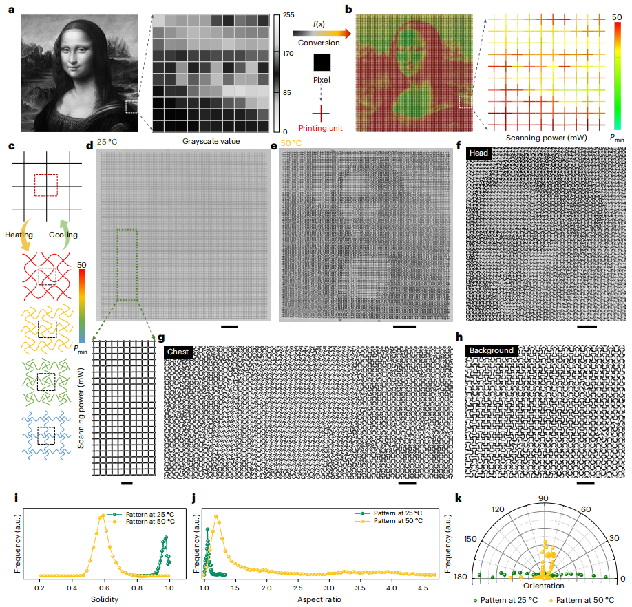 作为概念验证,他们能够对印刷结构中的任何图像的灰度信息进行编码和映射,从而根据广泛的可重构图案进行信息加密。如上所述,在 2PP 过程中,通过不断改变扫描功率或扫描速度,可以将具有相同晶格尺寸(即相同的 D 值)的印刷晶格转换成不同的图案。作为演示,他们将一幅 100 × 100 像素2 的《蒙娜丽莎》离散图像(图 5a)中每个像素的灰度值转换为 10,000 个单个尺寸为 10 × 10 µm2 的印刷十字单元的扫描功率映射(图 5b),这些单元相邻互连,没有任何间隙,从而实现了金属晶格的编程。LIHAM 作用超结构的一个典型特征是其在转化后的最终模式中具有广泛的可编程性。如图 5c 所示,不同扫描功率的交叉组合晶格可以在加热和冷却时可逆地转变为不同的拓扑结构。由于扫描功率是连续的,因此相应的印刷单元可以转化为宽光谱图案。