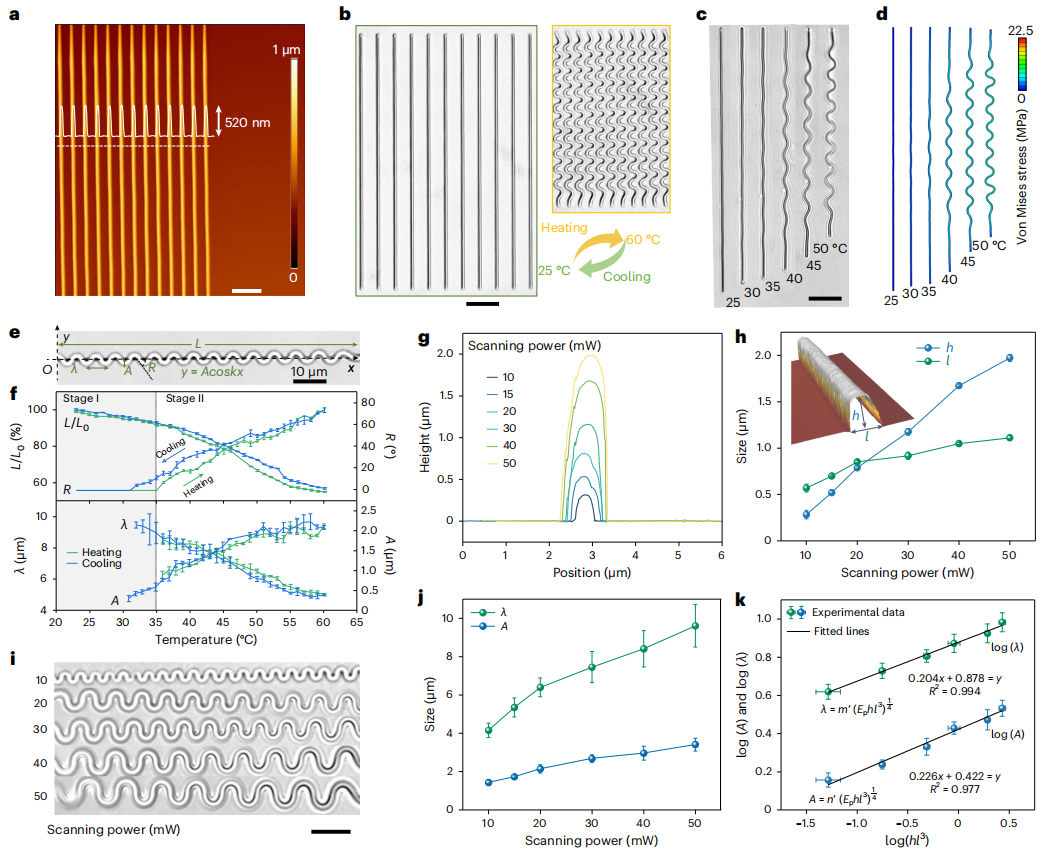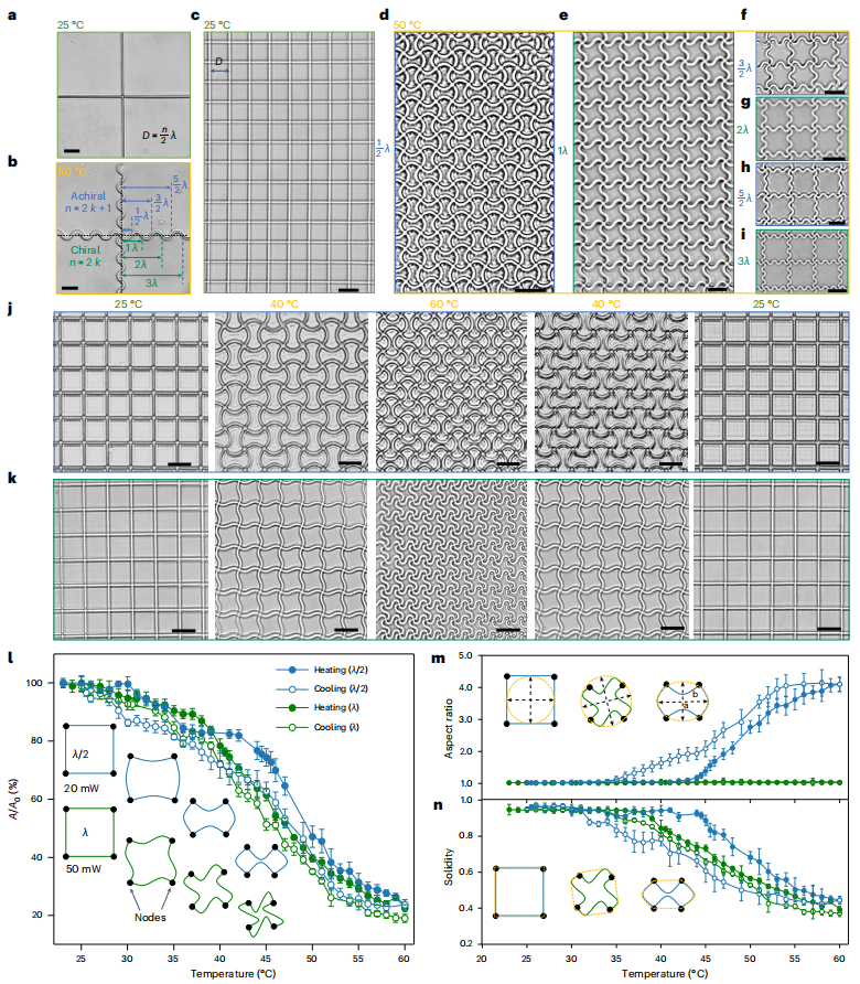 超材料是一类由周期性排列的基本单元组成的人造材料,具有超越天然材料和体积相似材料的奇特性能,如可调节的机械性能、负折射率和负泊松比。与传统的被动和静态行为相比,超材料在受到光、热、水合、磁场、电场和电化学场等外部刺激时会发生几何形变,其刺激响应、自适应和可编程的特性和功能引起了跨学科的广泛兴趣。将可编程致动的超结构转化到微米或纳米尺度,将为开发高密度功能子单元提供巨大机遇,从而推动实验室芯片技术、微型机器人、物理智能机器、低能耗机械计算以及可调光子和声子设备的发展。然而,由于微米和/或纳米尺度的驱动机制通常只适用于特定材料,因此它们的微型化具有挑战性。此外,具有特定初始几何形状的超材料通常会转化为特定的最终构型,只有通过设计其他初始几何形状才能产生不同的最终构型。要实现从相同的初始几何图形转化成可编程的多样化配置,具有很大的挑战性。例如,kirigami 超结构中的某些规定切口只能生成特定的最终模式,而其他配置只能通过重新设计不同类型的切口(即接头与切口的比例)来实现。超结构缺乏广泛的可编程性,极大地限制了其设计多样性、功能和实际应用。