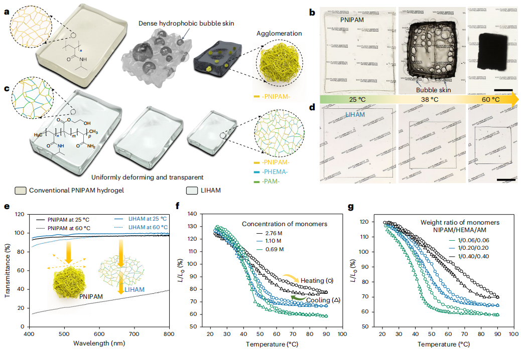 与纯 PNIPAM 水凝胶相比,合成的聚(NIPAM-co-HEMA-co-AM)水凝胶在保持高透明度的同时,变形非常均匀(图 2c、d)。LIHAM 由增强的亲水性聚合物链组成,它们有力地支撑和加强了网络系统,防止了 PNIPAM 聚合物网络在温度介导的亲水性和疏水性转变过程中发生坍塌。因此,这些增强聚合物链会均匀收缩,不会产生光散射团聚体,从而保持了 LIHAM 的透明度。图 2e 比较了聚合物加热到 60 °C 时的透射率(λ = 580 nm),显示 LIHAM 的损失(3.4%)可以忽略不计,而 PNIPAM 的损失则很大(71.2%)。此外,LIHAM 的变形能力可以通过调整单体的浓度(图 2f)和重量比(图 2g)来调节。
