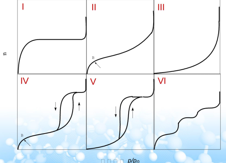 这种类型的等温线,在吸附剂孔径大于20 nm时常遇到。它的固体孔径尺寸无上限。在低P/P0区,曲线凸向上或凸向下,反映了吸附质与吸附剂相互作用的强或弱。