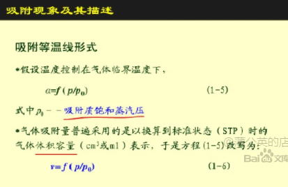 D.吸附平衡等温线:以压力为横坐标,恒温条件下吸附质在吸附剂上的吸附压力为纵坐标的曲线,通常用比压(相对压力)P/P0表示压力,P为气体的真实压力,P0为气体在测量温度下的饱和蒸气压。