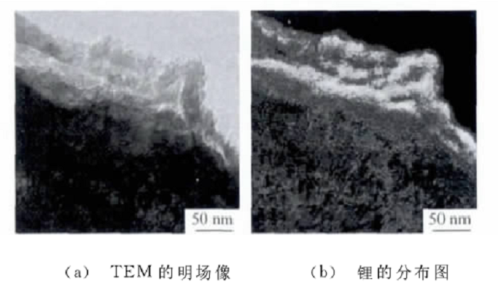 元素成分分布图是利用某一特征能量损失的电子信号来成像,根据所成图像可以知道元素的分布规律。EELS的元素成分分布图主要有TEM-EELS作图和STEM-EELS作图两种。锂电池现在是最流行的可充电电池,然而电极中锂的直接观察到现在还没解决。锂的K-吸收边很明显,可以根据这一特征能量,做出锂的元素成分分布图,如图6所示,采用TEM-EELS模式来对锂进行观察,其中(b)中浅色表示锂的存在。