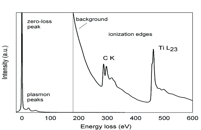 2)通过对表面态的研究来研究薄膜镀层的光学性质、界面状态和键合情况;3)通过对吸附物质振动的研究可以了解吸附分子的结构对称性、键长度和有序问题以及表面化合物的鉴别;5)通过对金属和半导体的光学性质的研究,了解空间电荷区中的载流子浓度分布及弛豫过程等。二、电子损失能谱根据能量损失可以分三个区:零损失区、低能损失区和高能损失区。图2:20 nm厚度的碳化钛样品在装有能量过滤分光仪的传统200 KeV的TEM下的电子能量损失谱(EELS)光谱该区域包括未与原子发生任何散射作用的“零损失”电子、与原子核发生弹性散射未损失能量的电子和发生很小能量损失的非弹性散射。