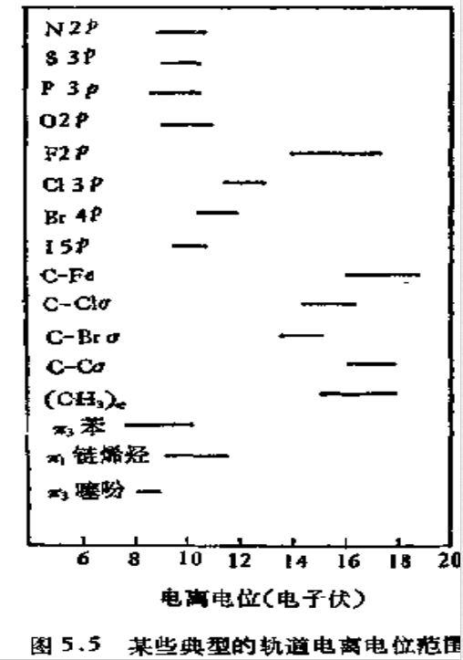 轨道电离电位与轨道环境有关,必须考虑电子接受或授与原子或原子团的影响。考虑这种影响可用几种方法。非键电子通常高度定域在分子中的特定原子上,其能量很大程度上取决于该原子的电负性。根据元素电负性的不同,监视特定谱带的电离电位随各种取代基而变化,有可能推测谱带的性质和起源。