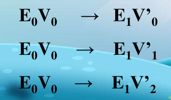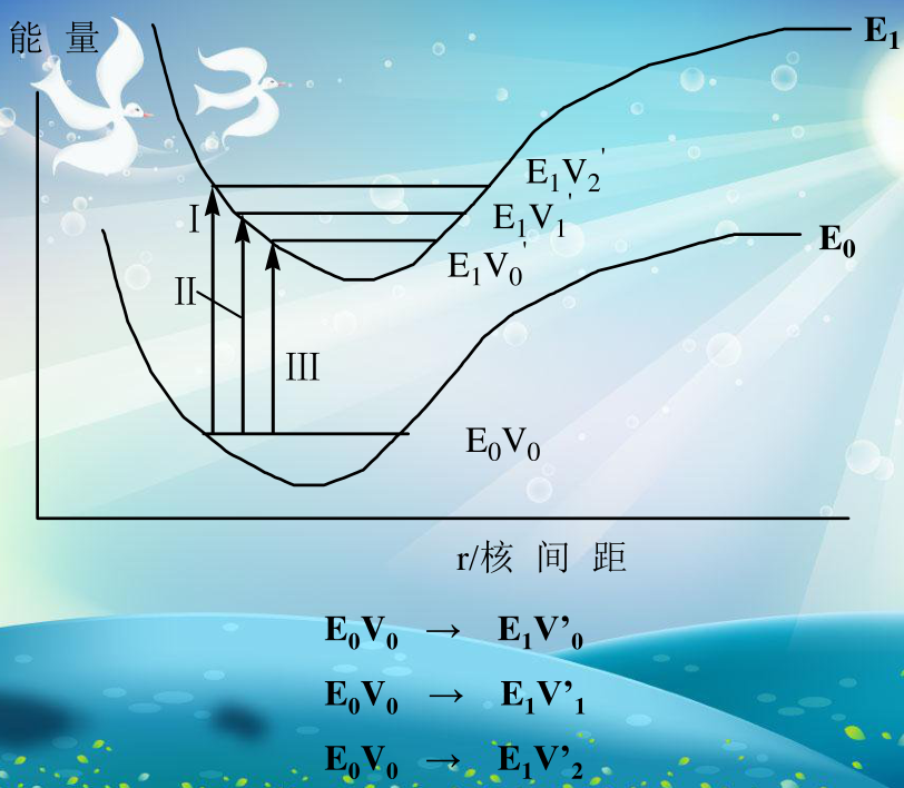 E0、E1为电子能级,其中还有不同的振动能级V0, V1,V2,V3......,跃迁时: