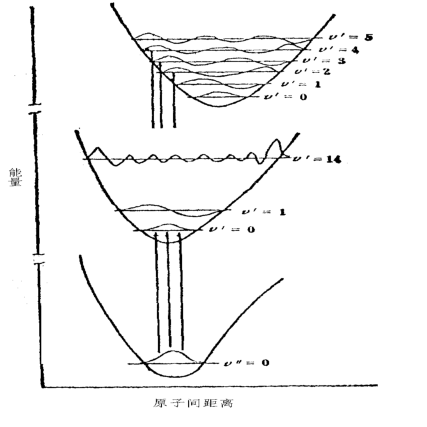 电子可由基态跃迁到激发态的不同振动能级,电子跃迁一定伴随着能量较小变化的振动能级和转动能级的跃迁。