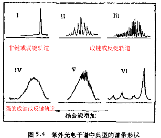 从非常强的成键或反键轨道发生的电离作用往往呈现缺乏精细结构的宽谱带,见图中Ⅳ。缺乏精细结构的原因是振动峰的能量间距过小;有时振动精细结构叠加在离子离解造成的连续谱上,形成图中的谱带Ⅴ。