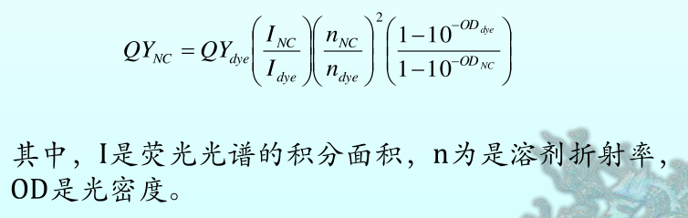 荧光量子产率的数值,有多种测试方法,一般采用参比法。这种方法是通过比较待测荧光物质和已知荧光量子产率的参比荧光物质两者的稀释溶液在同样激发条件下所测的的积分荧光强度(即校正的发射光谱所包括的面积)和对该激发波长入射光的吸光度而加以测量的。量子产率计算使用下面的公式(公式1):