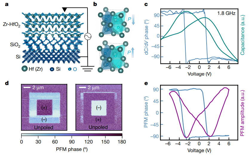 美国加州大学伯克利分校Suraj S. Cheema教授和Sayeef Salahuddin教授(通讯作者)报道了一种通过在硅上通过低温原子层沉积(ALD)生长的超薄(1 nm)Hf0.8Zr0.2O2(HZO)中的铁电材料,二次谐波的产生和先进的扫描探针技术分别确定了反转对称破坏和可切换电极化的存在。相关论文以题为“Enhancedferroelectricity in ultrathin films grown directly on silicon”于2020年4月22日发表在Nature上。在超薄层状物中增强铁电性的方法为设计极化驱动存储器和铁电晶体管提供了新的思路。这项工作将寻找铁电的基本极限转移到更简单的过渡金属氧化物体系,即从钙钛矿衍生的复合氧化物转移到萤石结构的氧化物,从而稳定了超薄状态下的铁电性能。