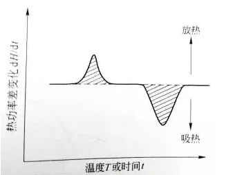 试样在加热过程中由于热效应与参比物之间出现温差△T时,通过差热放大电路和差动热量补偿放大器,使流入补偿电热丝的电流发生变化。试样在热反应时发生的热量变化,由于及时输入电功率而得到补偿,所以实际记录的是试样和参比物下面两点热补偿的热功率之差随时间t的变化,即dH/dt-t关系。如果升温速率恒定,记录的也就是热功率之差随温度T的变化dH/dt-T关系,如下图2。