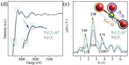 对Ti-K边缘进行了XANES分析,以监测由Al3+插层引起的峰位置的移动,如图d所示。TiK边缘XANES在4971 eV处呈现相对较弱的前边缘峰,在4985 eV附近呈现较强的主吸收峰。识别到边缘偏移,这表示较低的Ti氧化状态。表明Ti3C2Tx-MXene在Al3+插层后从其他材料获得了大量电子。