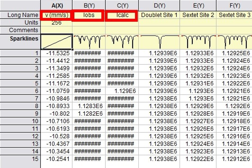 纵坐标lobs为原始实验数据点,Icalc为总的拟合线,后面几列分别为各种亚谱,对应不同的铁的物相;
