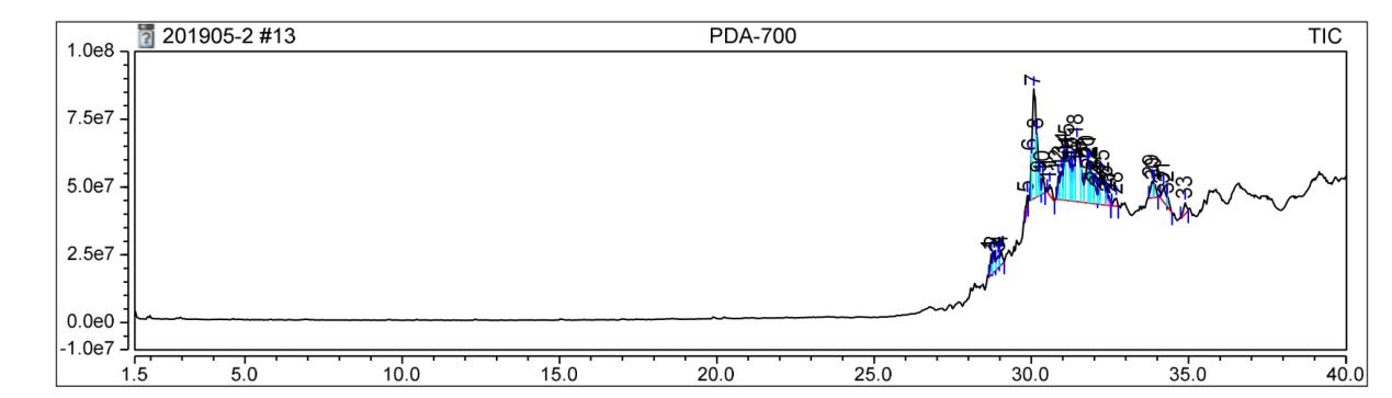 PY-GC-MS三个样品5个数据,峰都在一起,分不清是什么物质是什么原因呢?最后峰还一直在上面飘着,也没有降下来,如下图